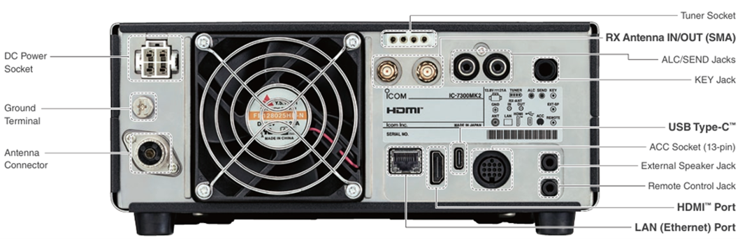 Porta Ethernet LAN integrata (stessa funzione del IC-7610) per un facile funzionamento remoto con RS-BA1 versione 2 (opzionale); il ricetrasmettitore è gestibile via rete/Internet — compresa accensione/spegnimento — senza alcun PC server in stazione