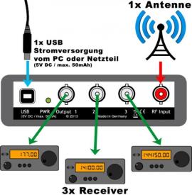 L' AAS300 distribuisce il segnale in ingresso quasi senza perdite ulteriori alle tre uscite, e grazie all'elevato isolamento tra le uscite evita le interferenza reciproche tra ricevitori. Grazie all'alimentazione USB a basso consumo, il dispositivo è utilizzabile anche in portatile.